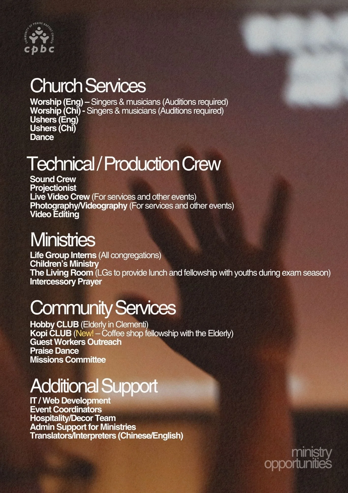 In the e-form below, you can indicate the top three areas of service you would like to be involved with. The respective ministry coordinators will then get in touch with you to give you more information and answer questions you may have. The deadline for submission of this form will be 14 April.